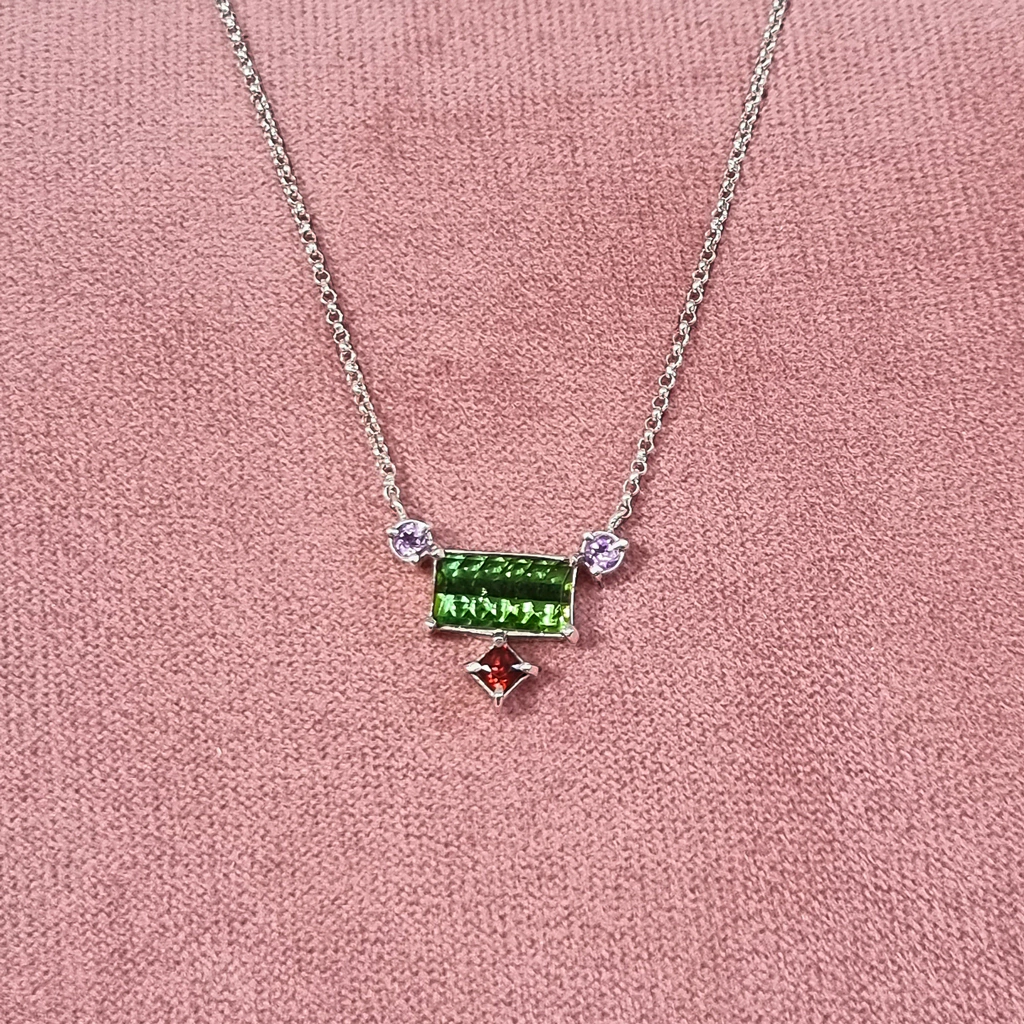 pedras: turmalina verde com lapidação Millenium, ametista e granada